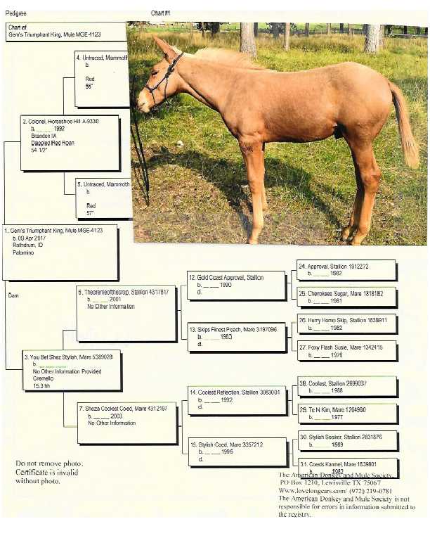 Gem's 'Gem’s One More Mile (Magnus) was purchased in utero by Hannah Kimball. He is a creamy (thank you Rylea-a Cremello) leggy, palomino John mule. He is our biggest baby yet, weighing 110 lbs when born! The ‘One’ in the name is an ode to his jack sire, Genesis 1.0 (Onesey). Onesey has gained National attention in his short life with recent Fall ‘23 accomplishments as ‘Champion Model Donkey’ at both the North and South Carolina State Fairs. He has successfully competed in dressage, jumping, gaming and more! On the dam side, ‘You Bet Shez Stylish’ (Rylea) continues to be our most popular mare for in utero contracts as she predictably gives us pretty headed, good minded, athletic babies. Her babies are also proven in the show ring and on the trails, including Gemocha, Palmer & Eva. We are excited to see Hannah aspire to achieve her goals in jumping, performance, and more with this stunning baby.
